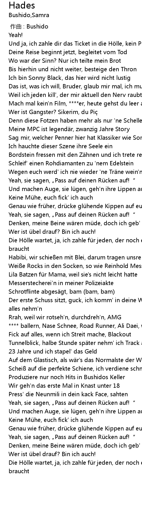 | [02:22.59] | Die Hölle wartet, ja, ich zahle für jeden, der noch ein Ticket braucht |