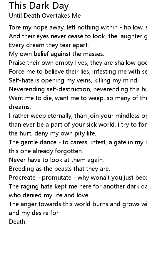 I rather weep eternally, than join your mindless optimism, i rather die now, than ever be a part of your sick world. i try to forget all this pain, deny all the hurt, deny my own pity life. |