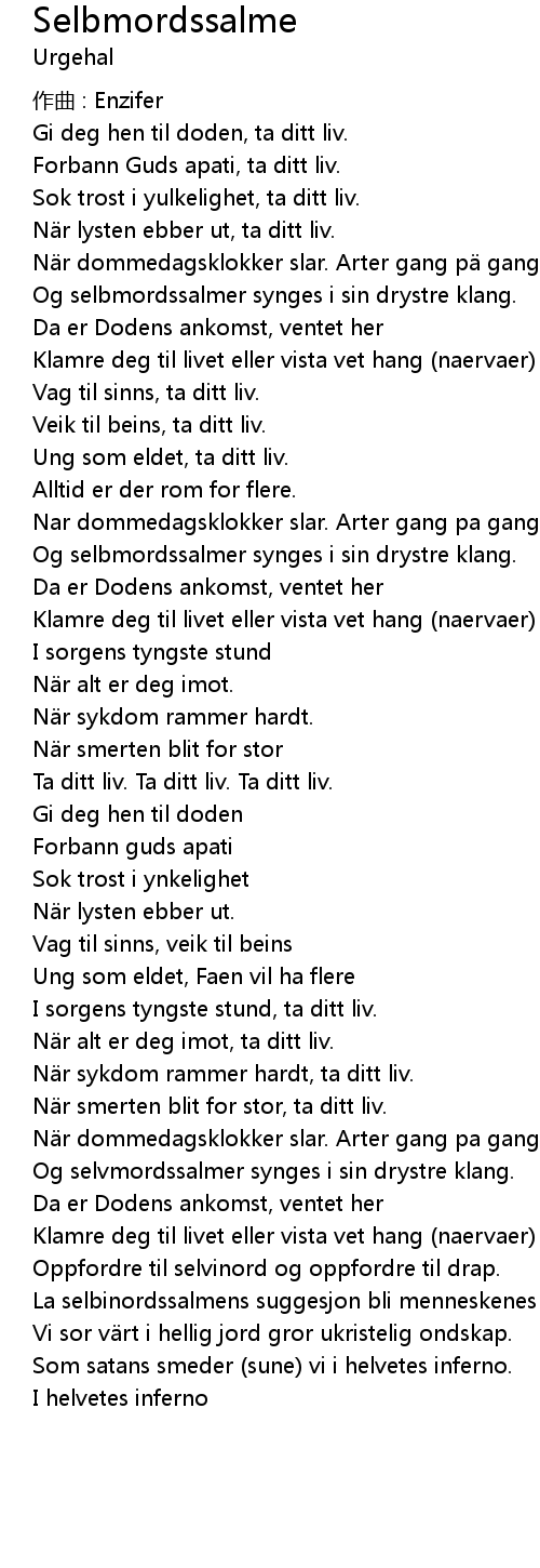 | Og selvmordssalmer synges i sin drystre klang. | |