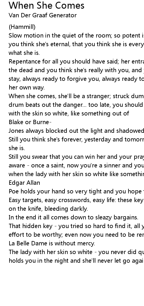 When she comes, she'll be a stranger; struck dumb, you'll try to protest as the drum beats out the danger... too late, you should have noticed that the lady with the skin so white, like something out of |
