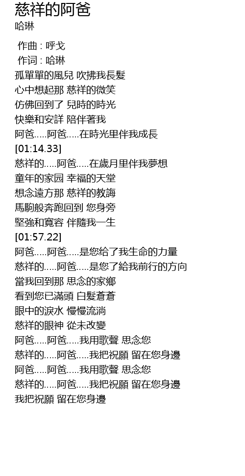 | [03:23.54] | 阿爸…..阿爸…..我用歌聲 思念您 |
