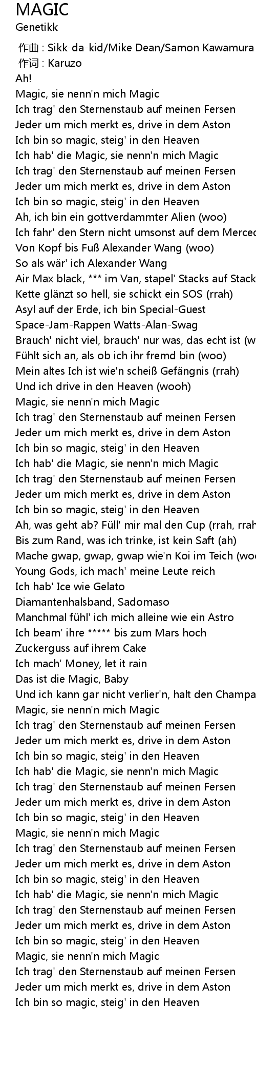 | [01:13.70] | Ich hab' die Magic, sie nenn'n mich Magic |