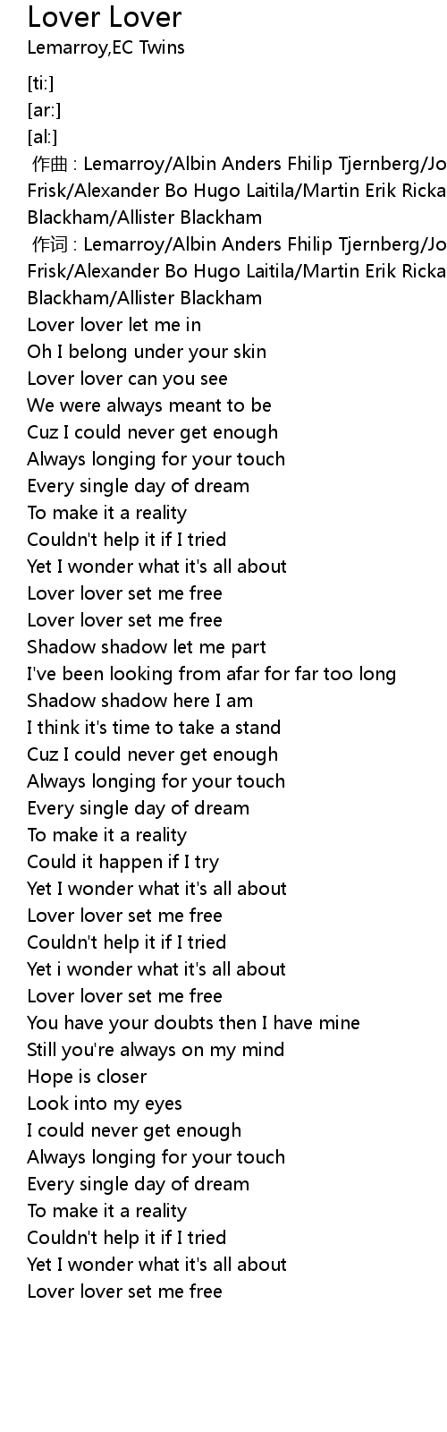| [00:01.000] | 作词 : Lemarroy/Albin Anders Fhilip Tjernberg/Jonas Erik Frisk/Alexander Bo Hugo Laitila/Martin Erik Rickard Olsson/Marc Blackham/Allister Blackham |