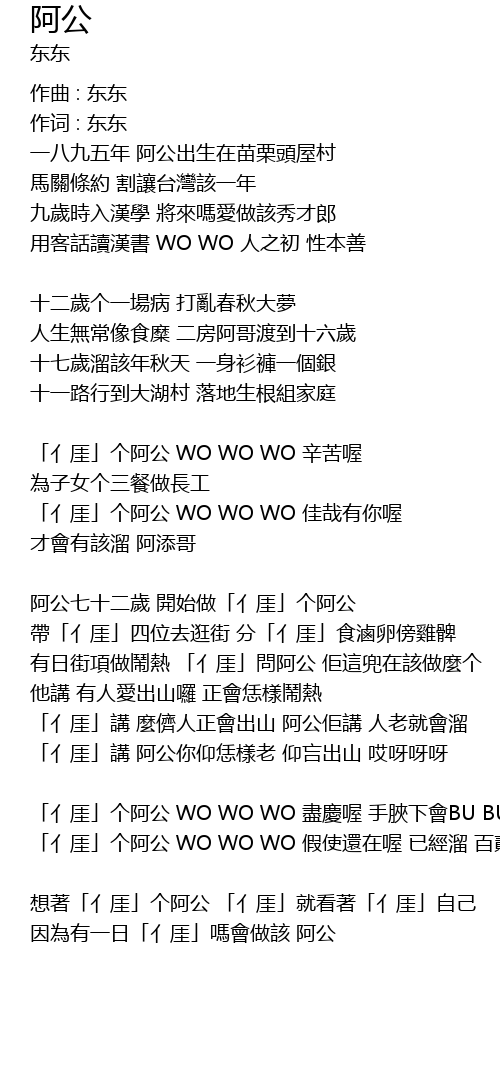 | 「亻厓」講 阿公你仰恁樣老 仰吂出山 哎呀呀呀 | |