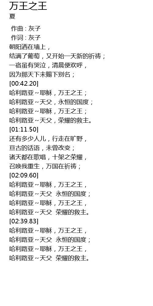 | [00:43.66] | 哈利路亚~耶稣,万王之王; |