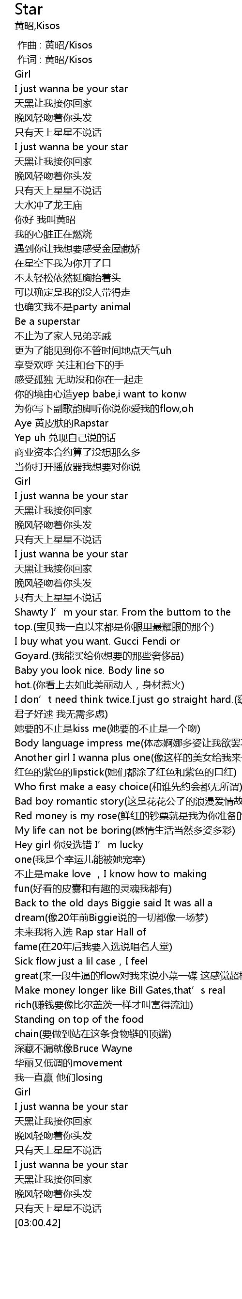 | [01:48.30] | Shawty I' m your star. From the buttom to the top. bǎo bèi wǒ yī zhí yǐ lái dōu shì nǐ yǎn lǐ zuì yào yǎn de nà gè |