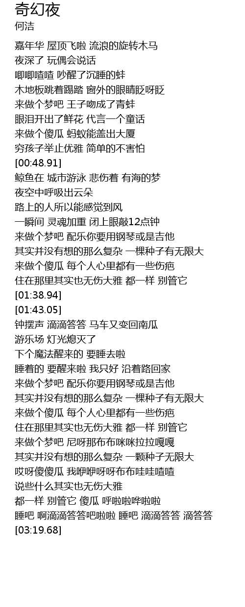 | [03:08.93] | 睡吧 啊滴滴答答吧啦啦 睡吧 滴滴答答 滴答答 |