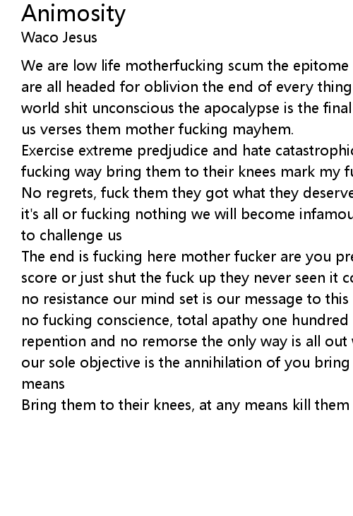 We are low life motherfucking scum the epitome of human degradation fuck you we are all headed for oblivion the end of every thing is the way it has to be this world shit unconscious the apocalypse is the final consequence global terrorism us verses them mother fucking mayhem. |