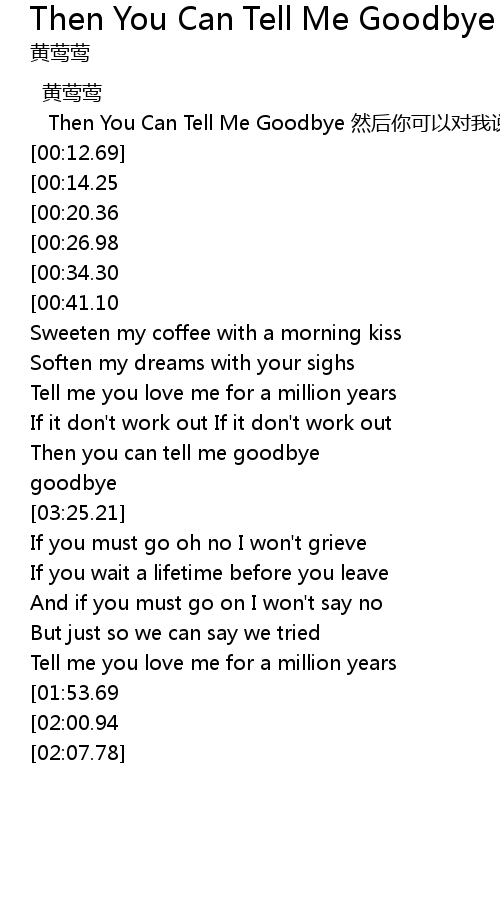 | [00:08.72] | Then You Can Tell Me Goodbye rán hòu nǐ kě yǐ duì wǒ shuō zài jiàn |