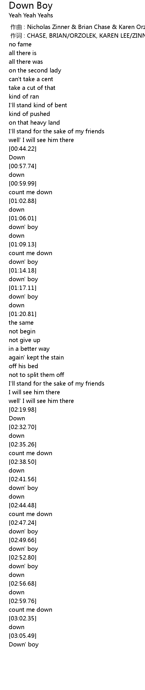 | [00:00.00] | 作曲 : Nicholas Zinner & Brian Chase & Karen Orzolek |
