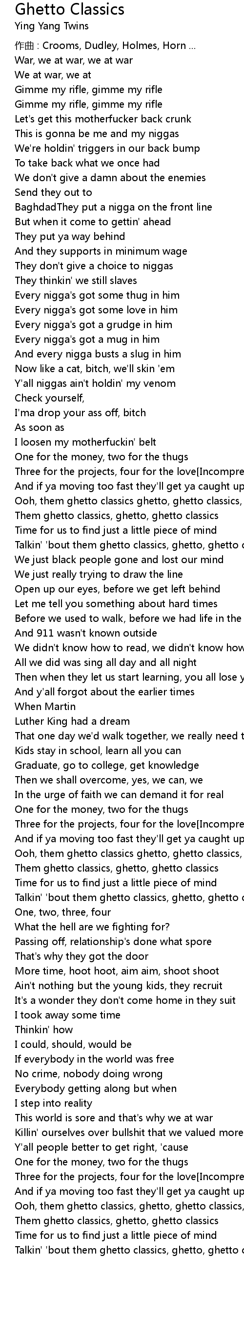 | Ooh, them ghetto classics ghetto, ghetto classics, ghetto | |