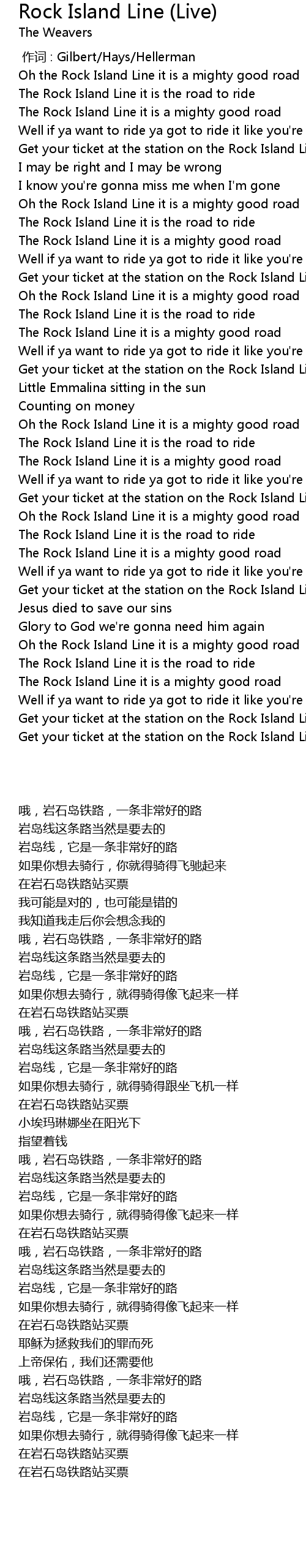 | [00:32.67] | The Rock Island Line it is a mighty good road |