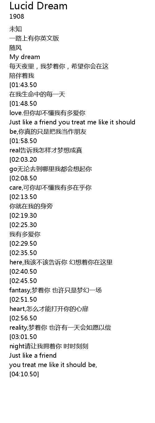 | [00:10.50][01:43.50] | I dream of you everyday of my life, mèng zhe nǐ zài wǒ shēng mìng zhòng de měi yì tiān |