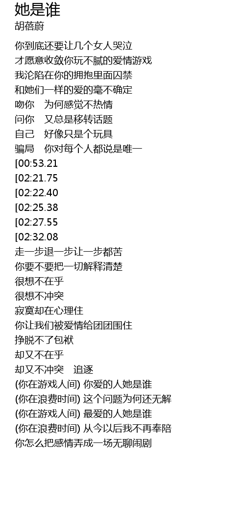 | [01:47.23] | (你在游戏人间) 你爱的人她是谁 |