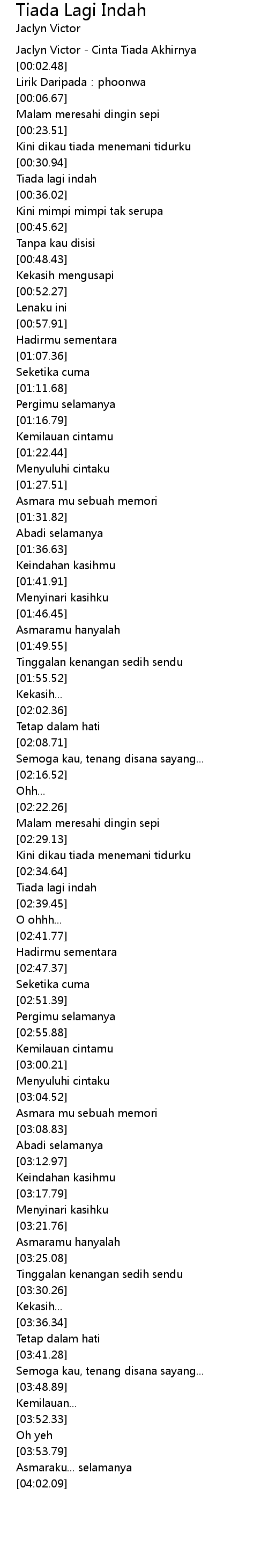 | [00:-1.00] | Jaclyn Victor - Cinta Tiada Akhirnya |