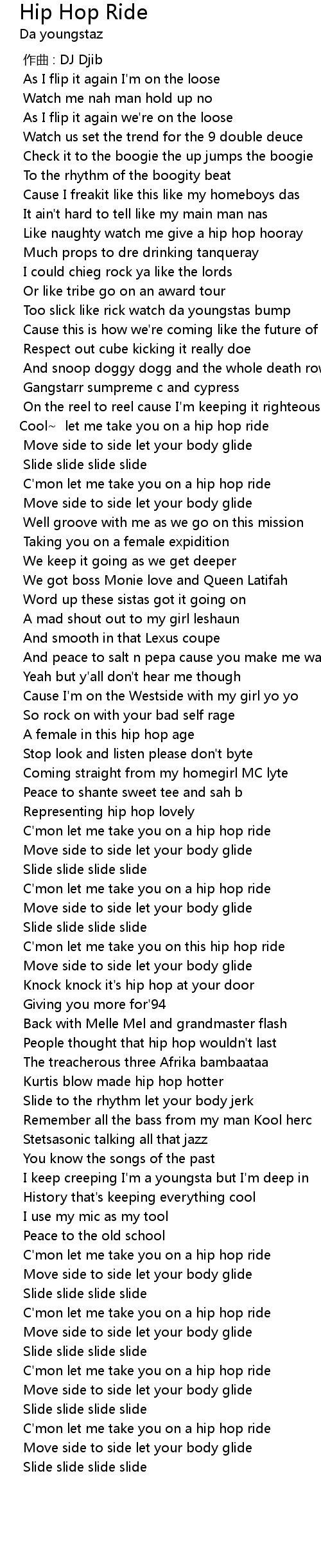 | [02:19.090] | C' mon let me take you on this hip hop ride |