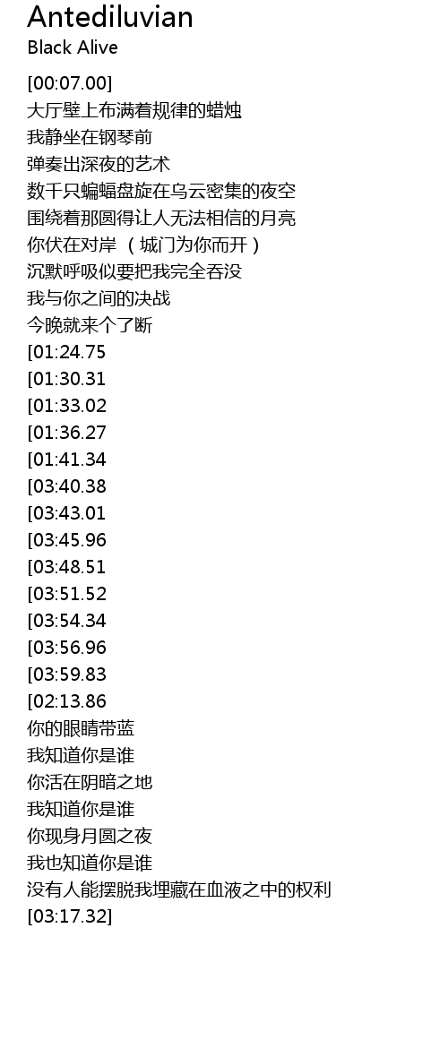 | [04:22.33][03:59.83][02:06.85] | Antediluvian |