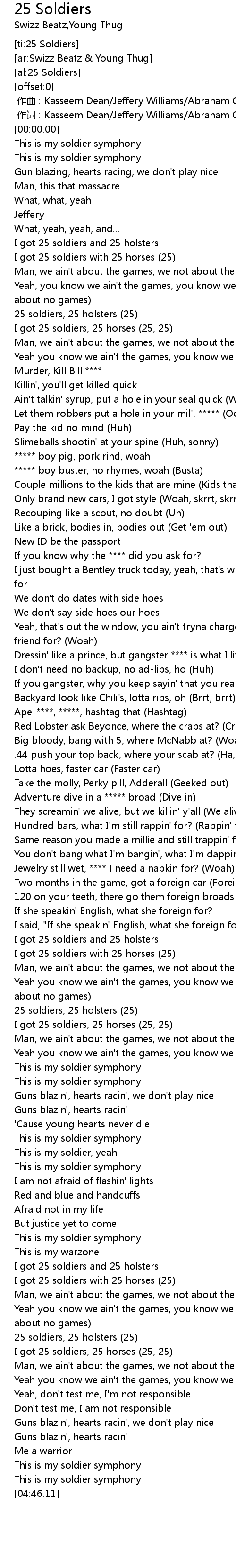 | [02:53.98] | I got 25 soldiers, 25 horses (25, 25) |