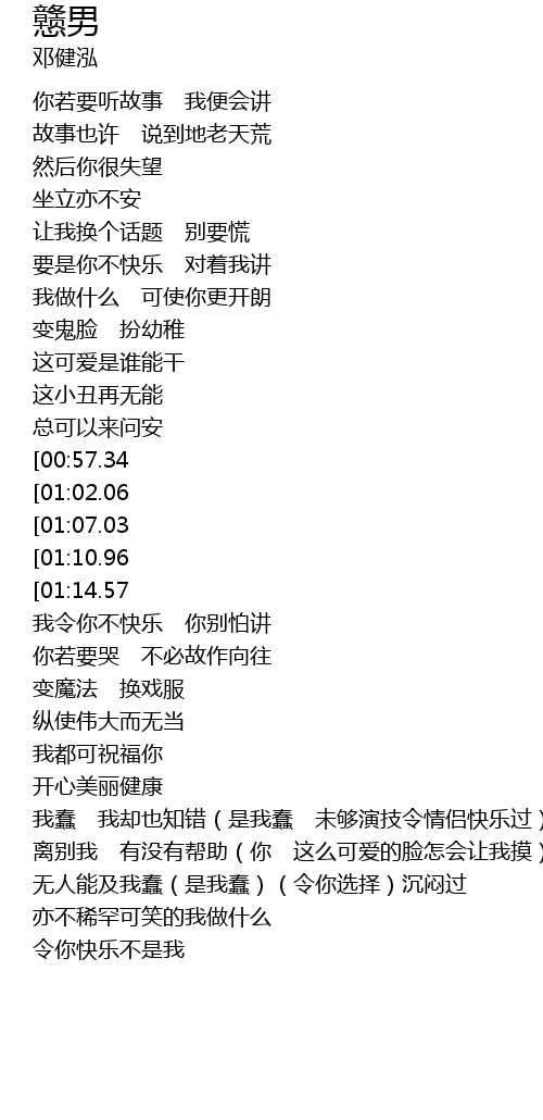 | [01:56.40][01:07.03] | 是我蠢 令你选择沉闷过 |