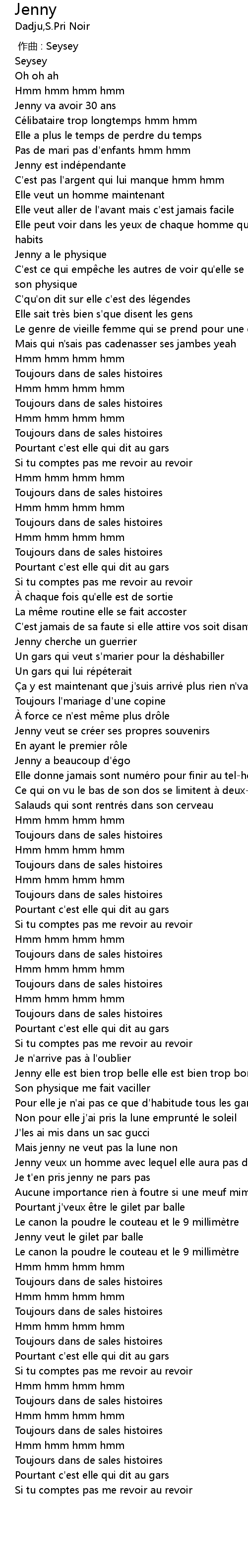 | [02:46.58] | Jenny veux un homme avec lequel elle aura pas d'soucis |