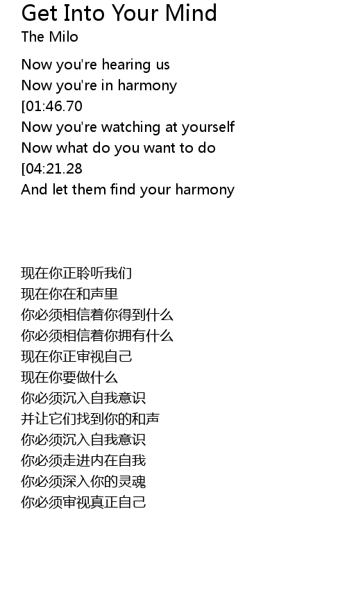 | [04:36.37][04:21.28][04:05.89][03:50.64][03:19.35] | You have to get into your mind |