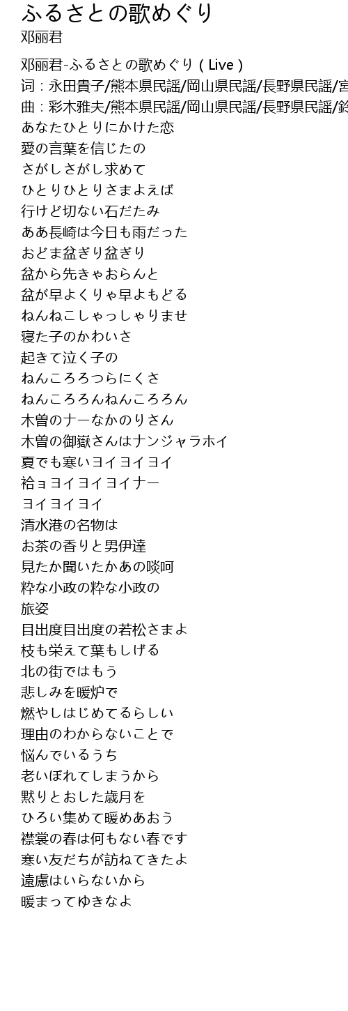 | [00:00.164] | 邓丽君-ふるさとの歌めぐり(Live) |