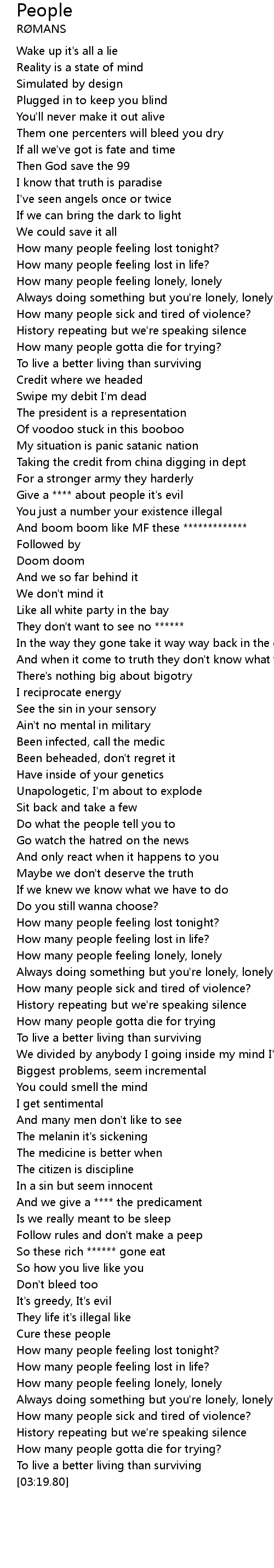 | [03:01.63] | How many people feeling lonely, lonely |