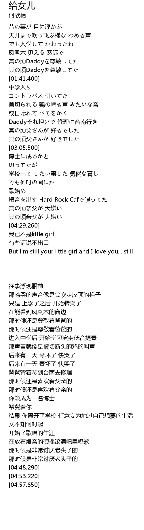 | [04:57.850] | But I' m still your little girl and I love you.... still |