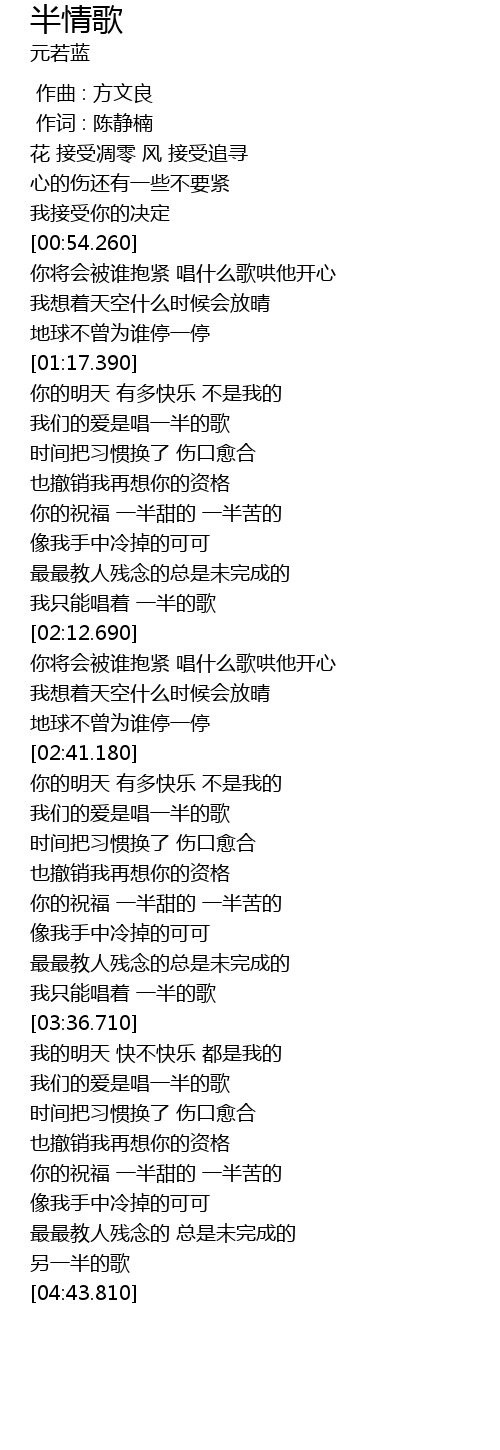 | [02:04.260] | 我只能唱着 一半的歌 |