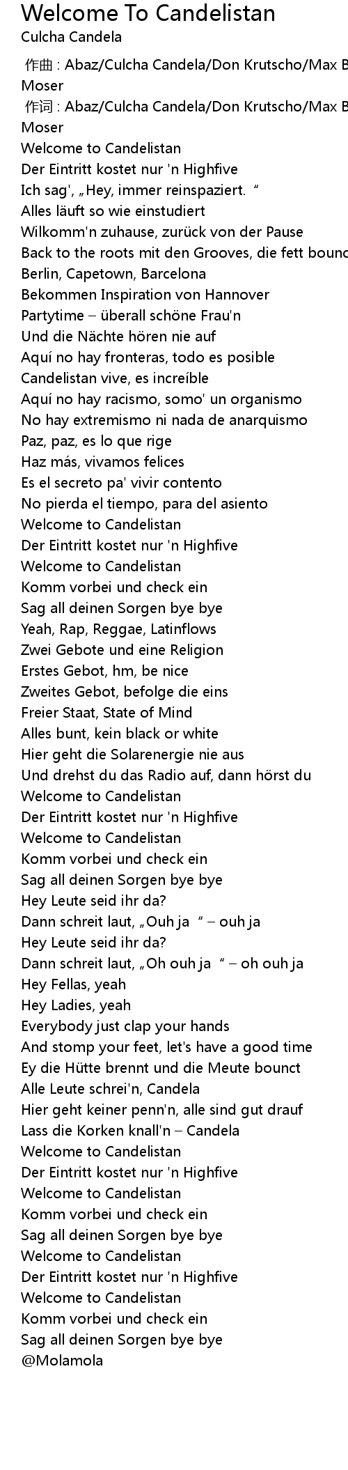 | [00:01.000] | 作词 : Abaz/Culcha Candela/Don Krutscho/Max Benrath/Sebastian Moser |