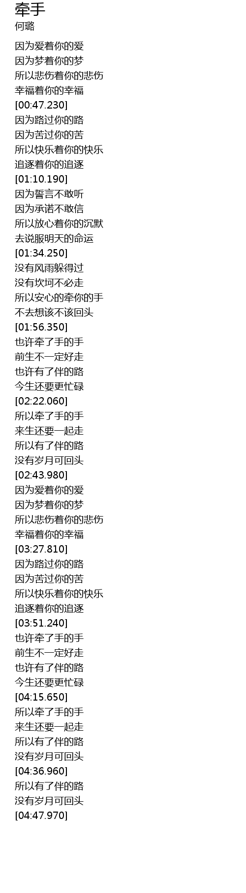 | [01:46.550] | suǒ yǐ ān xīn de qiān nǐ de shǒu |