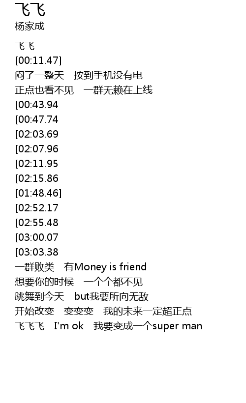 | [03:08.03][02:52.17][02:20.10][01:08.31] | 飞飞 Eeverday I'm ok |