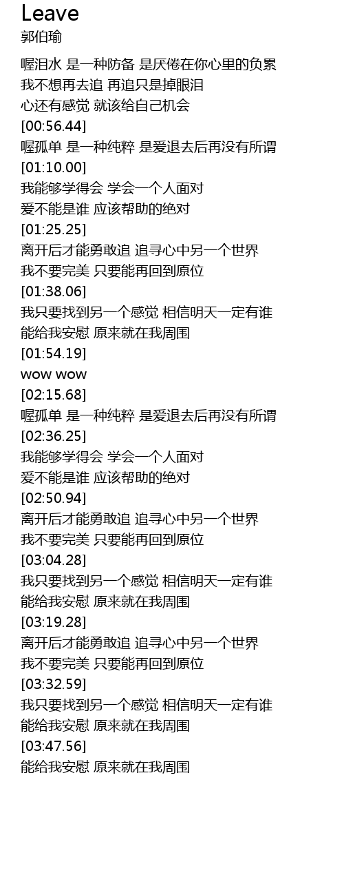 | [00:57.87] | 喔孤单 是一种纯粹 是爱退去后再没有所谓 |