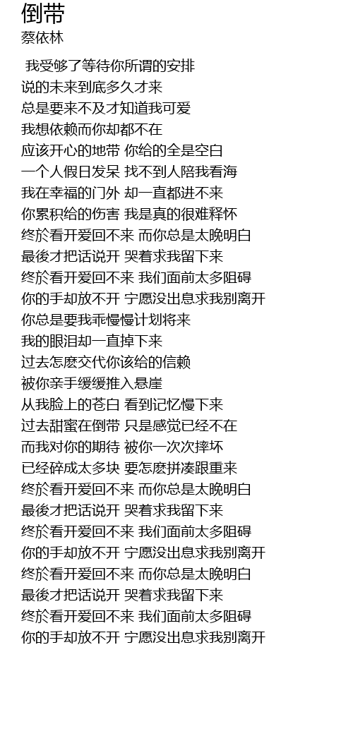| [03:22.680] | 你的手却放不开 宁愿没出息求我别离开 |