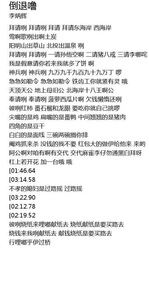 | [00:49.06] | 奉请咧 奉请咧 菠萝西瓜片啊 欠钱懒惰还咧 |