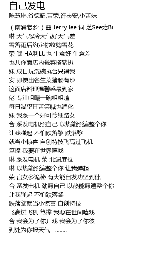 | [00:09.15] | (南涌老乡:)曲 Jerry lee 词 芝See菇Bi |