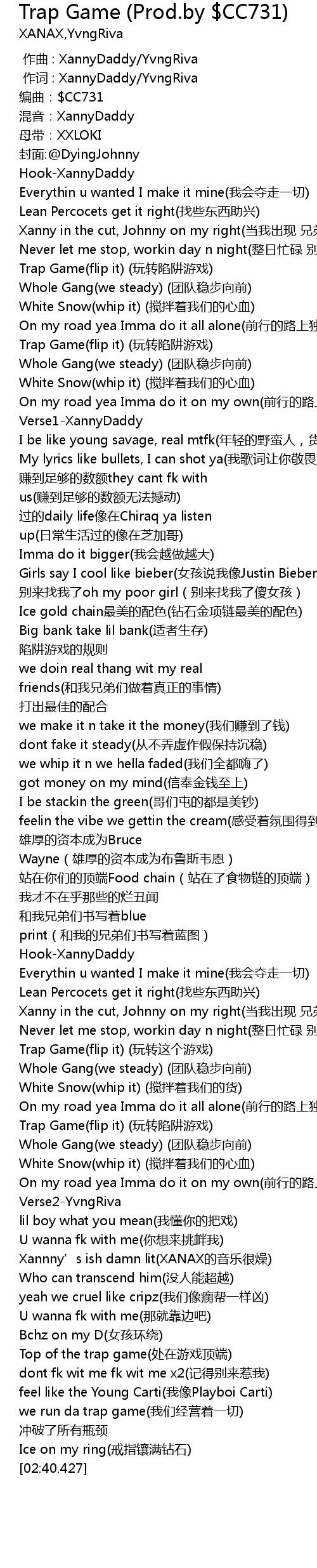 | [00:01.000] | zuo ci : XannyDaddy YvngRiva |