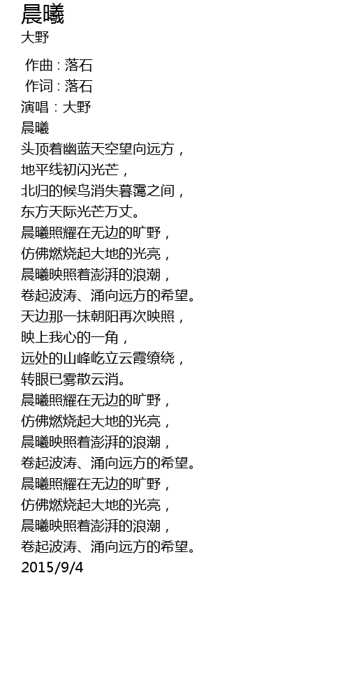 | [01:47.490] | 晨曦照耀在无边的旷野, |