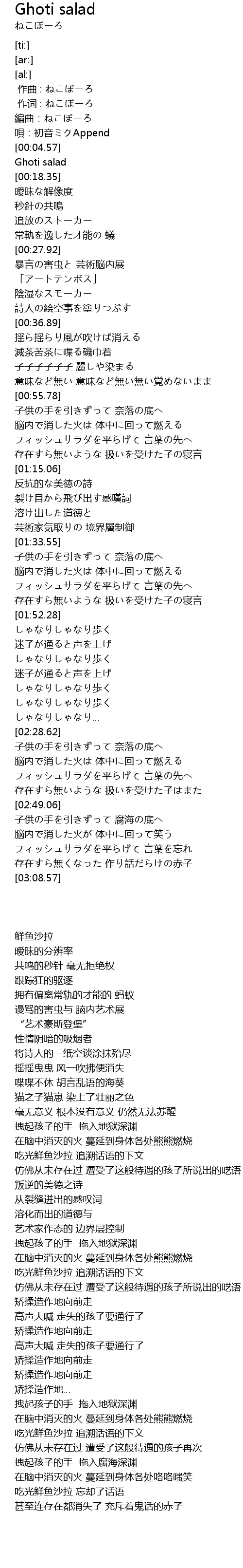 | [02:58.32] | フィッシュサラダを平らげて 言葉を忘れ |