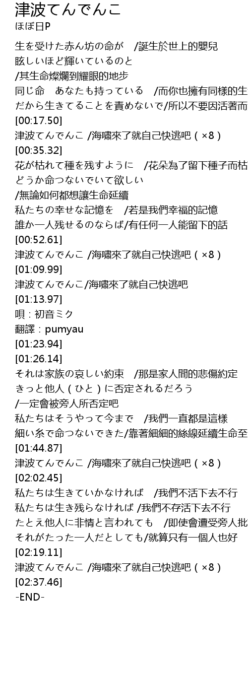 | [00:17.94] | 津波てんでんこ /海嘯來了就自己快逃吧(×8) |