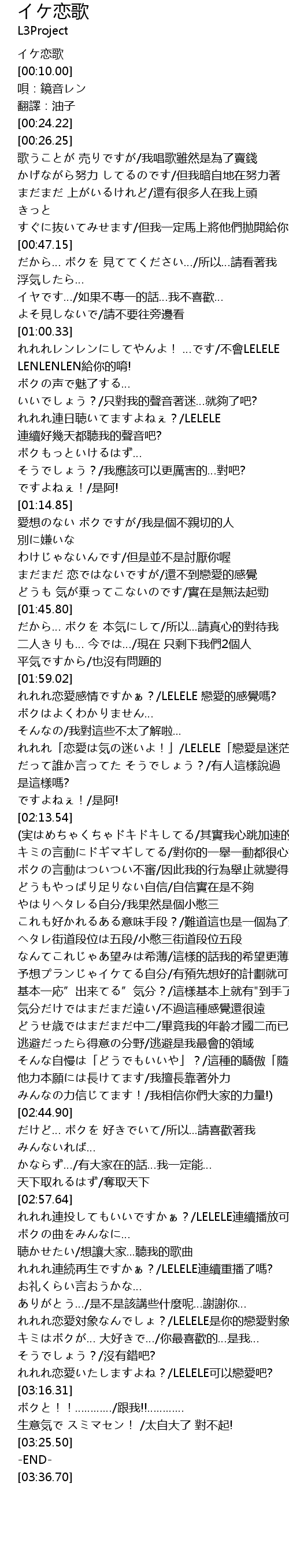 | [01:01.06] | れれれレンレンにしてやんよ! …です/不會LELELE LENLENLEN給你的唷! |