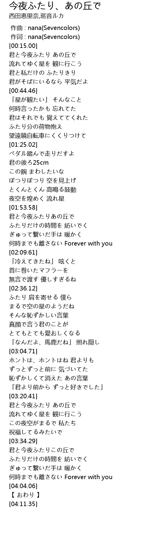 | [01:53.80] | 君と今夜ふたりあの丘で |