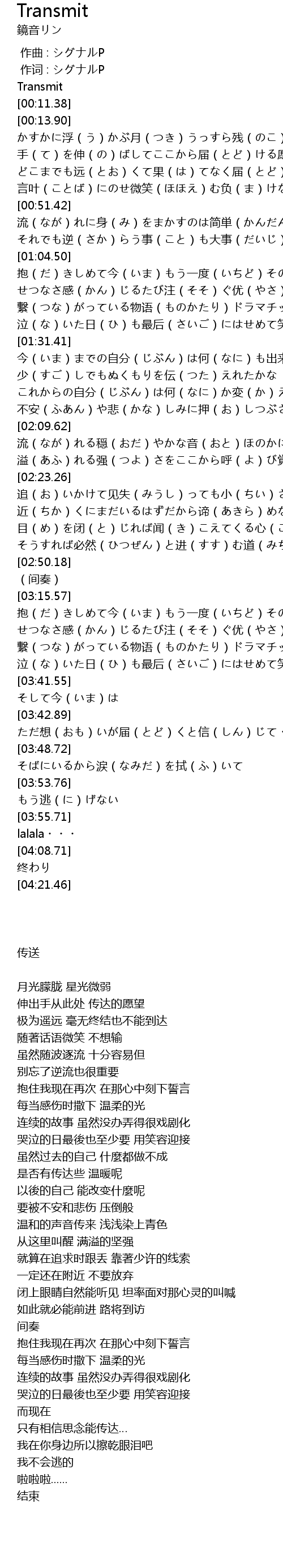 | [00:33.10] | 手(て)を伸(の)ばしてここから届(とど)ける愿(ねが)い |