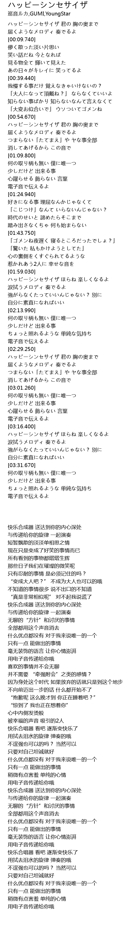 | [03:16.950] | ハッピーシンセサイザ ほらね 楽しくなるよ |