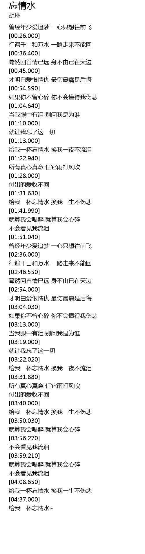 | [04:17.390] | 给我一杯忘情水 换我一生不伤悲 |