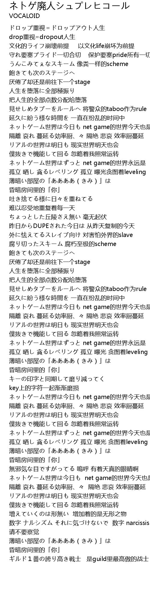 | [00:05.94] | ドロップ重視=ドロップアウト人生 drop重视=dropout人生 |
