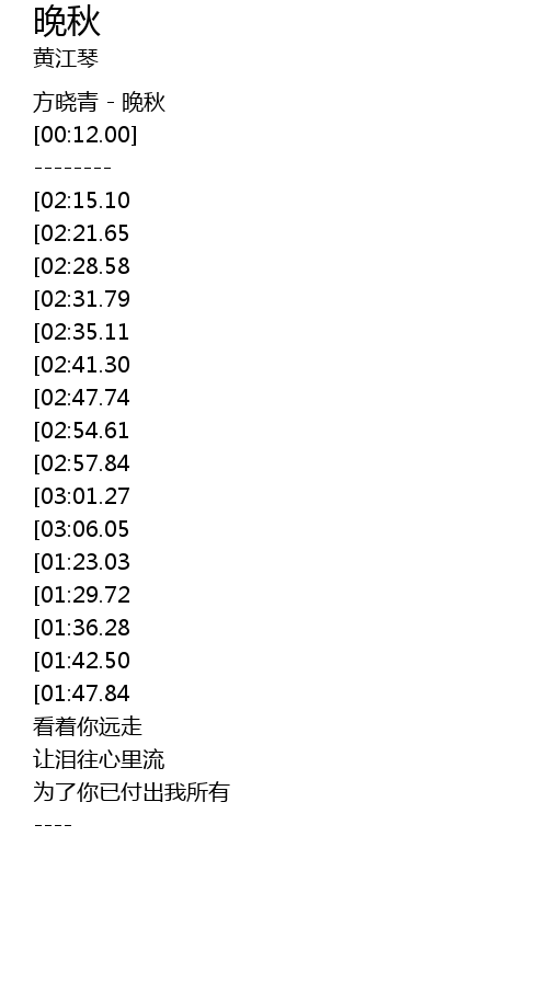| [00:00.00] | 方晓青 - 晚秋 |