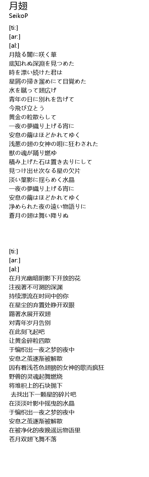 | [02:23.48] | 蒼月の翅は舞い降りぬ |