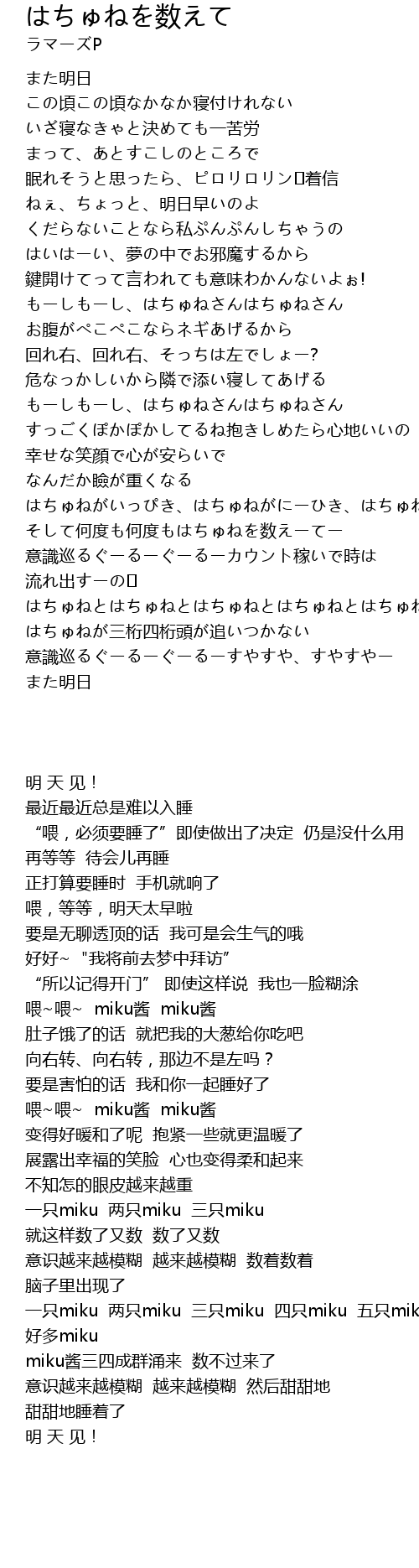 | [01:16.800] | そして何度も何度もはちゅねを数えーてー |