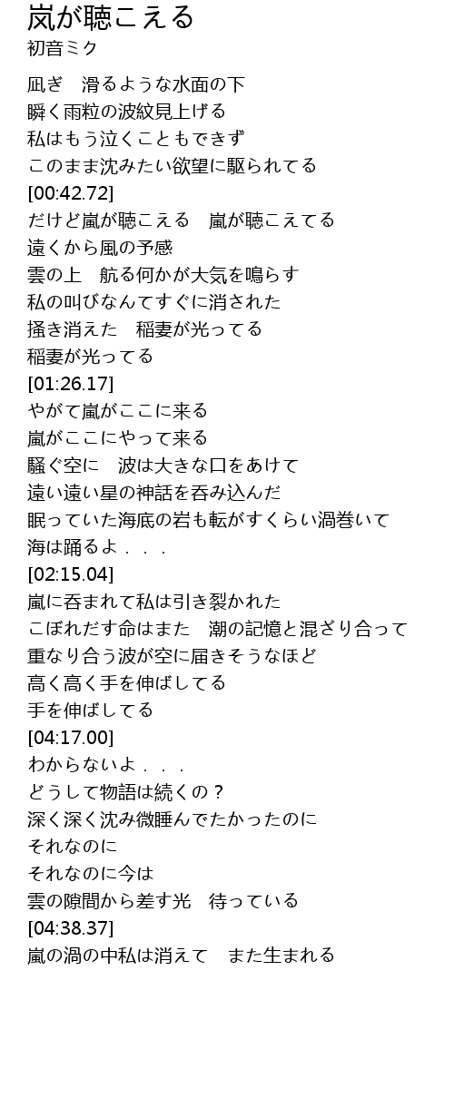 | [00:44.12] | だけど嵐が聴こえる 嵐が聴こえてる |